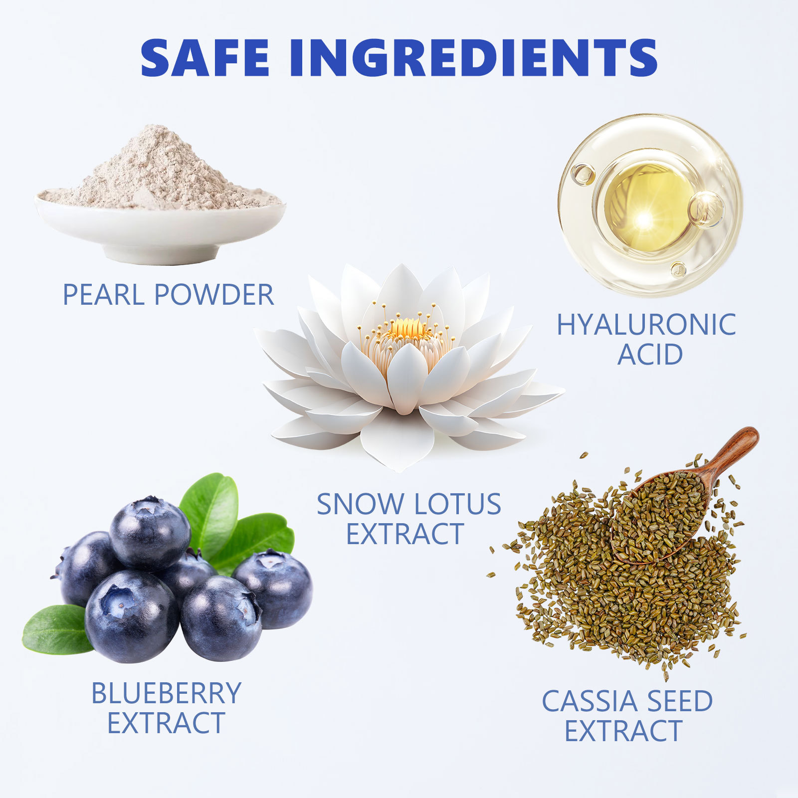 Product Ingredients: Purified Water, Snow Lotus Extract, Cassia Seed Extract, BlueberriesExtract, hyaluronic acid, pearl powder
